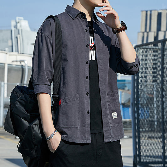 Summer New Korean Solid Color Loose 7-Sleeve Shirt Tide Brand Hong Kong Wind Men'S Work Shirt Coat